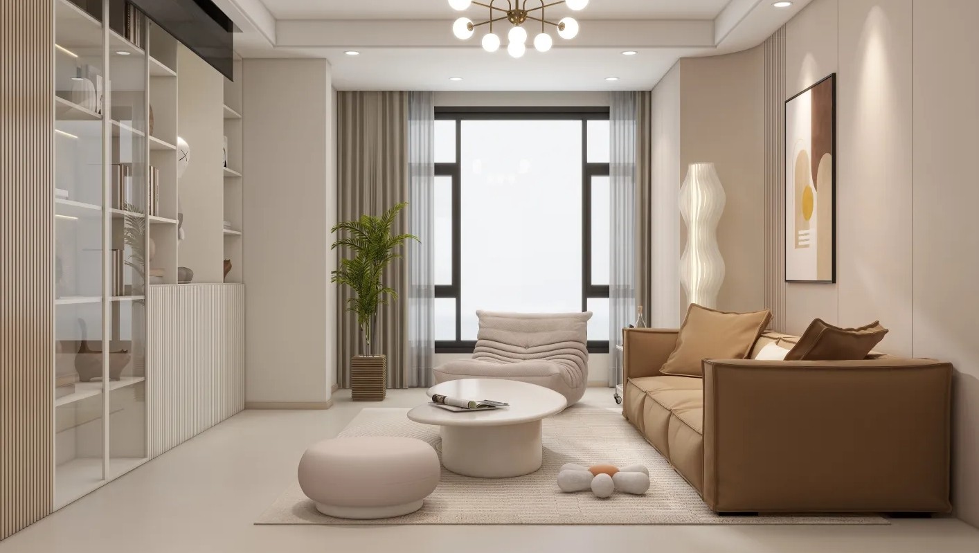 此案为2室2厅户型,建筑面积84平方,奶油风格设计。奶油风最直观也是最核心的特征就在於整体色调为奶油色,此案用奶油色及浅色原木来搭配,为空间增添更多人间烟火气的气息。硬装设计上,采用简单干净直爽的设计,让整体看起来简约而不简单;软装的搭配,要温柔、细腻,软装与硬装的搭配要协调,色调统一。