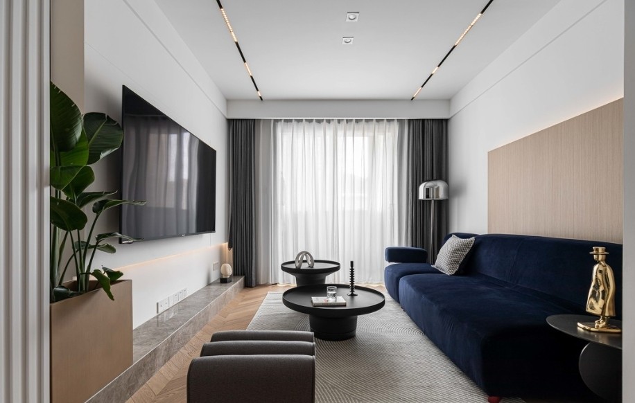 业主最喜欢的球队是巴塞罗那,客厅蓝色调主沙发由此而来,与浅灰色条纹地毯形成色彩对比.