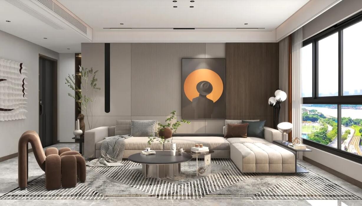 于方正之间融入现代家居理念,无主灯客厅布局规整却不失肆意自由的生活姿态。空间中一抹暖橘画饰带来鲜亮氛围,棕色系的单椅与格栅装点则为日常铺垫着端庄与典雅气质,让生活也就此覆上一层温馨色彩。
