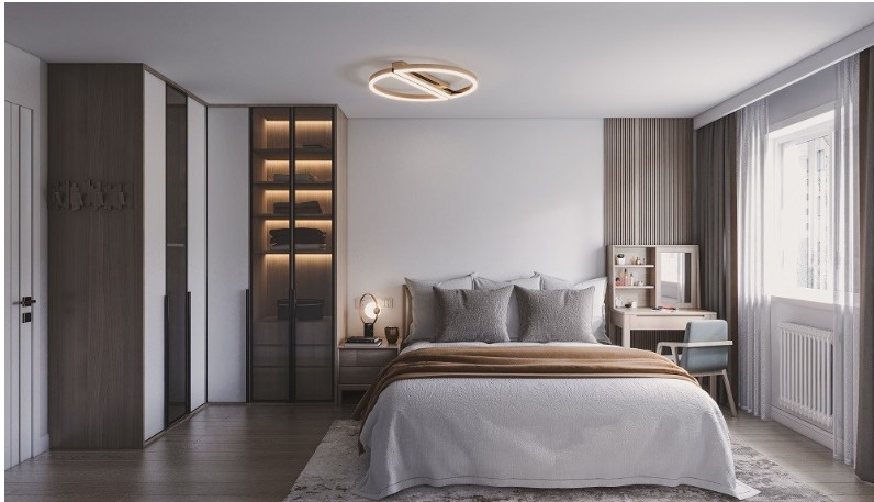 卧室配色简洁温馨,做L衣柜和展示柜相结合,然后展示柜作用内嵌灯带提高氛围和视角,然后梳妆台背景做木格栅和展示柜相呼应对称。