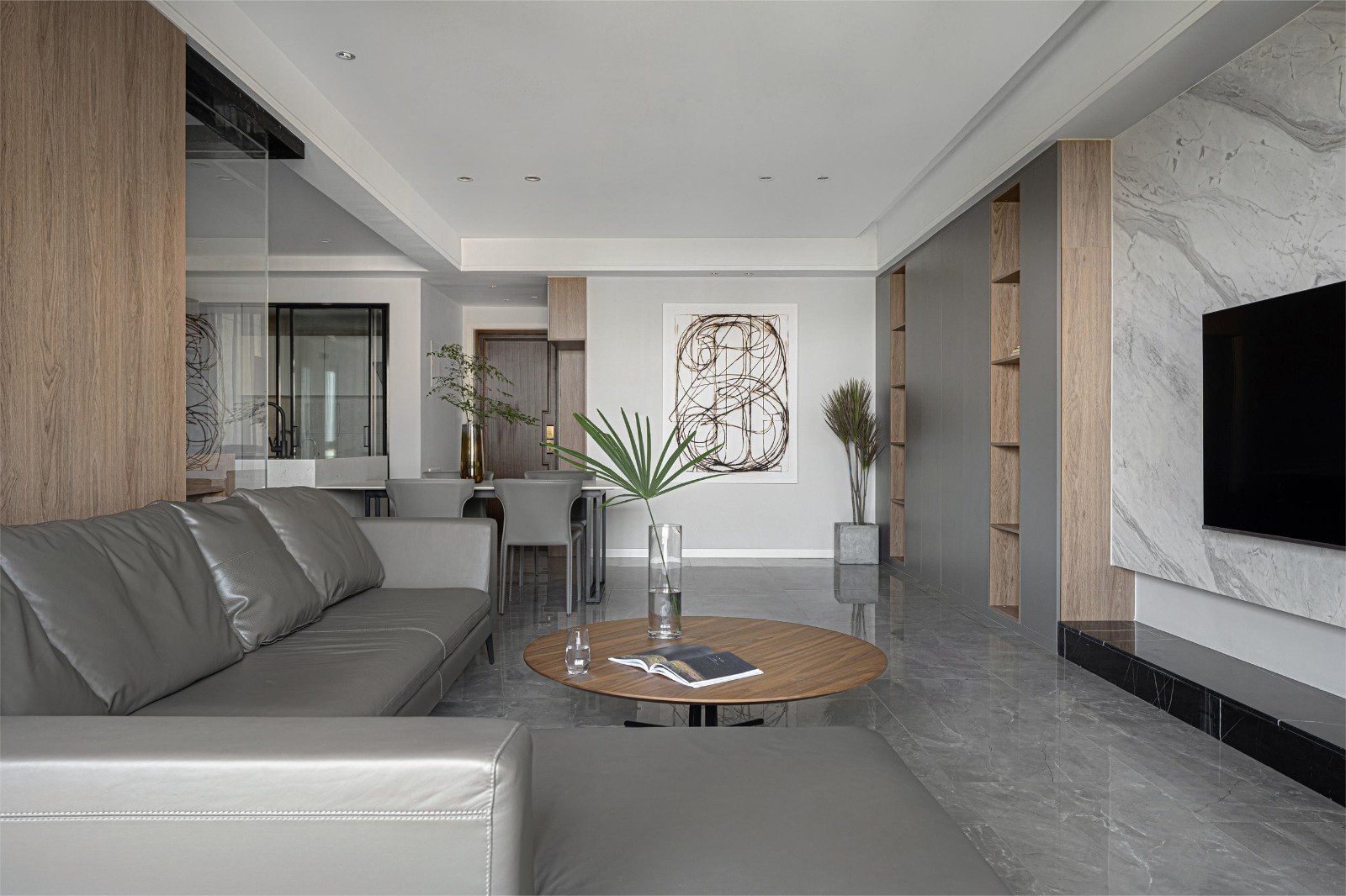 打破界限,用渐进的分界取而代之。冰川灰墙面、钢灰色柜门、白色大理石电视墙,拟以意境表达品味。在冷静的色彩、简洁的线条、卓越的工艺协调下,给人以自然随意之感,却又让每一处空间,都低调而不失精致。