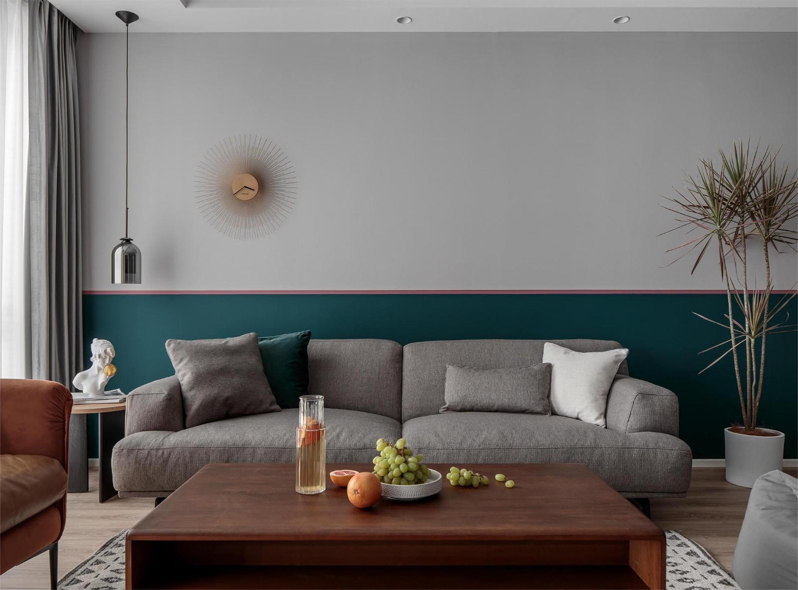墨绿、柿色以及少量的金属、玻璃在空间中进行穿插,制造出女屋主想要的复古摩登独立空间。