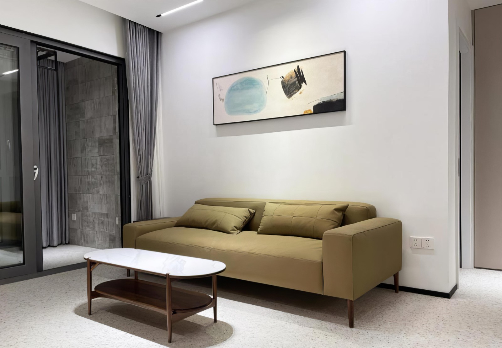 客厅背景墙留白,没有纷繁杂芜的装饰,一幅抽象画简单点缀,让空间小而美的精致,再加上暖色皮沙发,胡桃木结合岩板的原创茶几,在空间中极简又细腻。