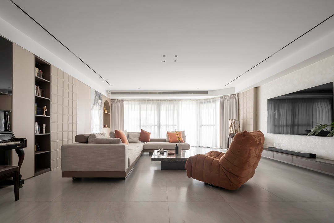 整体空间采用同一材质与色块的设计,保持布局中的“空”与极简,呈现侘寂风的随性之美 沙发背景通过规则的矩形阵列组长了一道道简单而又整体的矩形体块,空间显得更加简结而不失细节