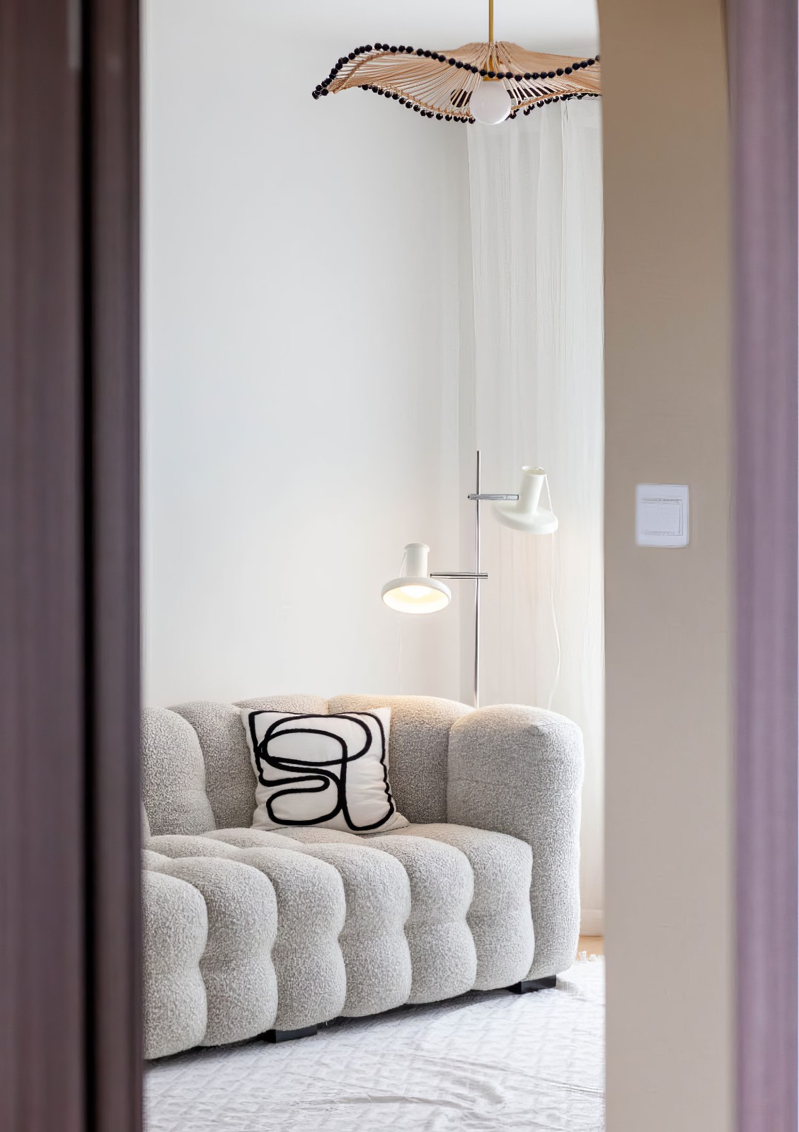 整墙的白色电视柜,为空间增加了充足的空间收纳,柜子与白色落地灯、白色薄纱窗帘融为一体。