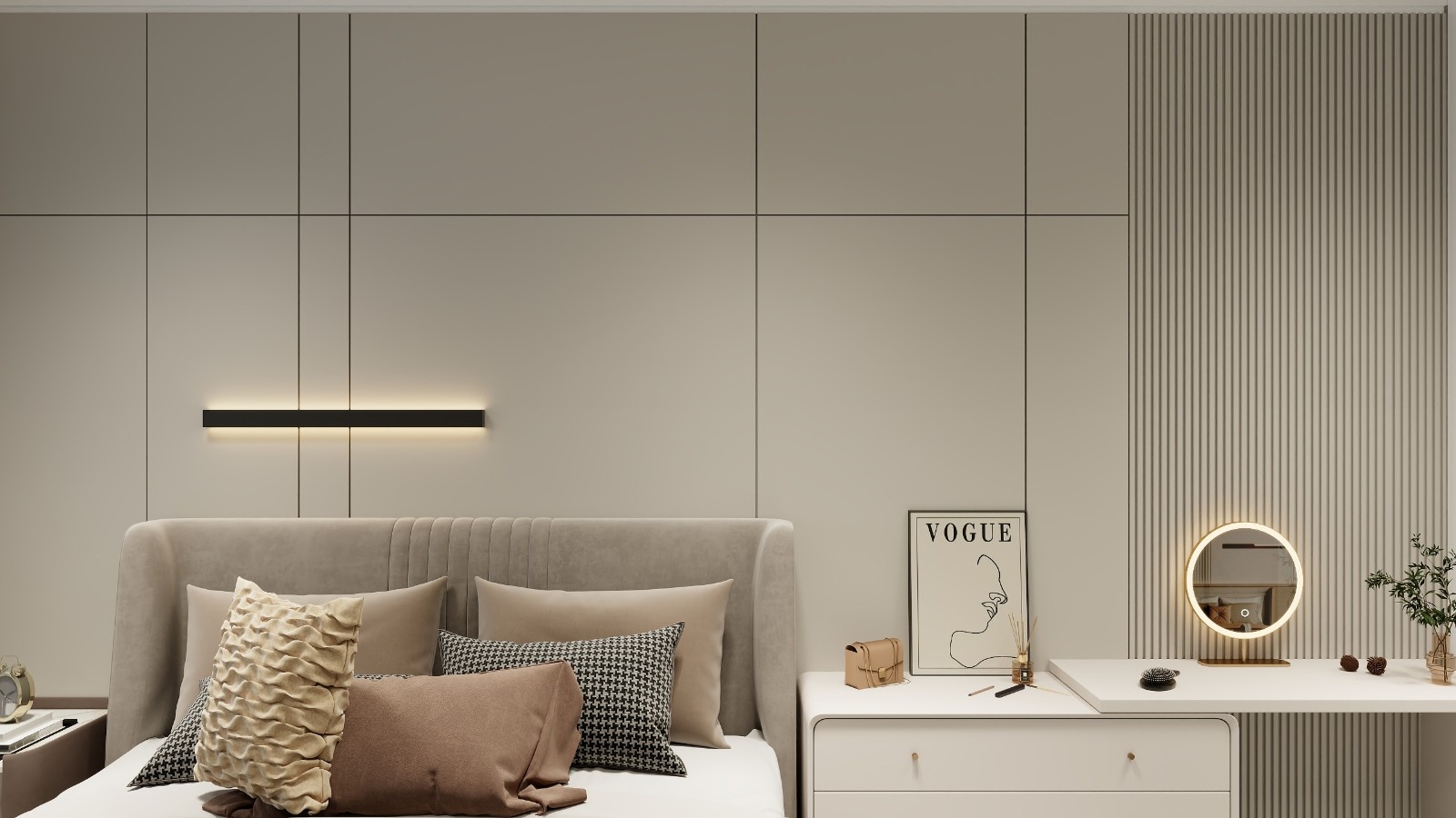 这个卧室将来是男女主人住,所以要亮一些,奢华一些。