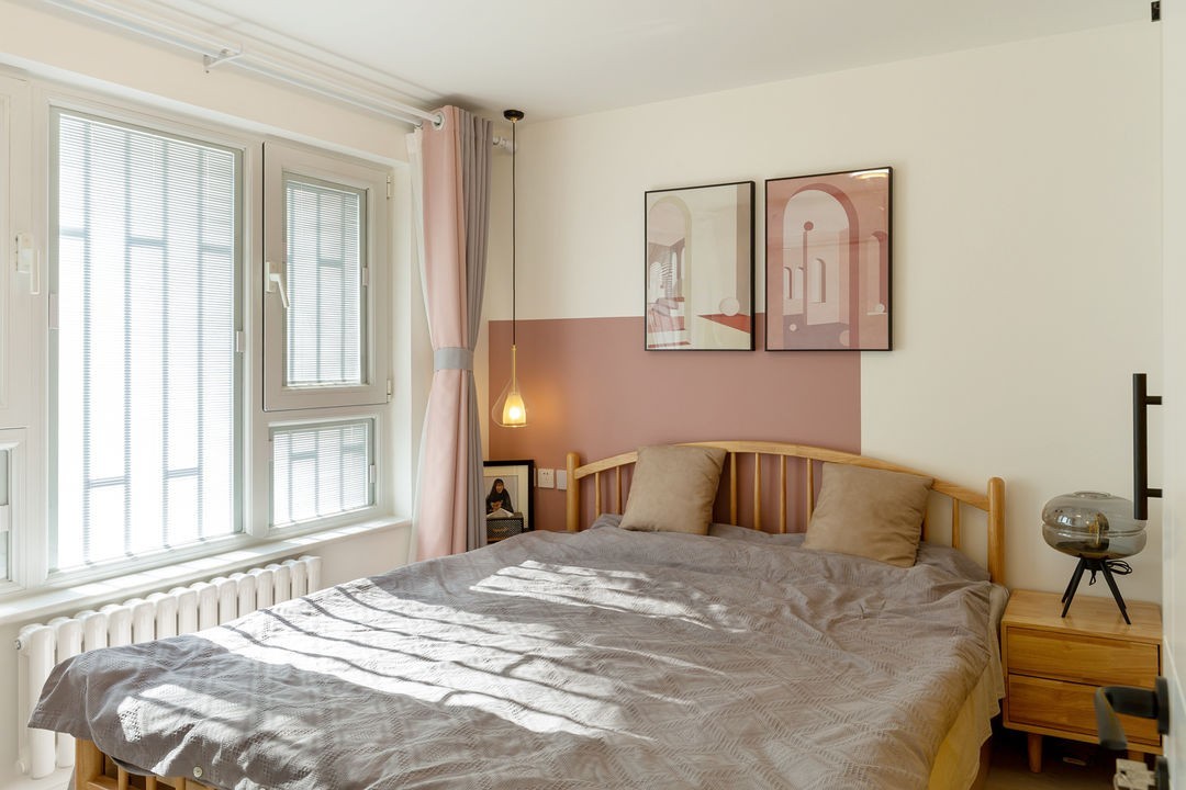 床头背景墙采用半墙式脏脏粉搭配,与客厅色调相呼应,搭配原木的温润自然,交织出清新宁静的羽然空间。