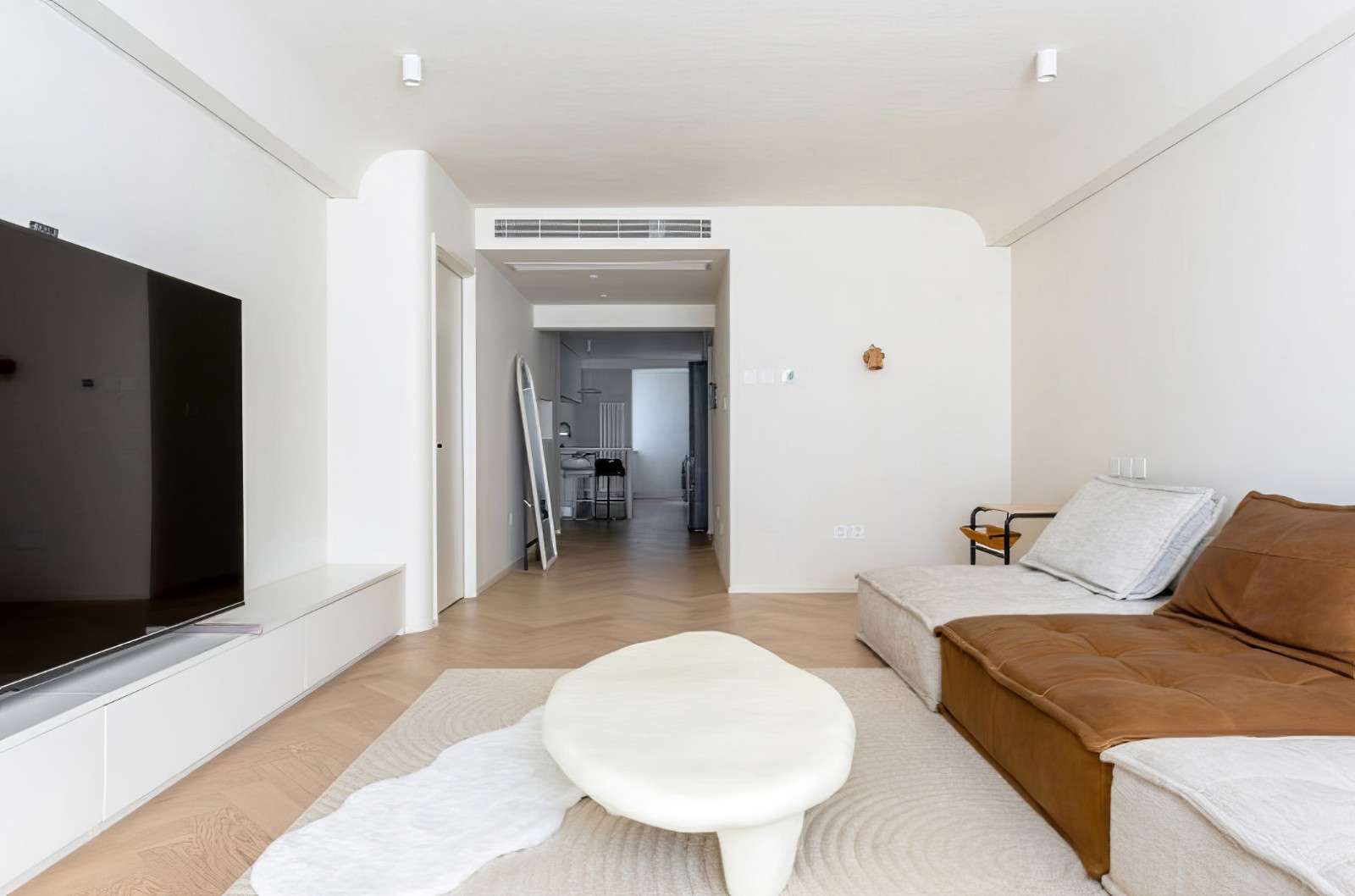极简风需要克制过多的装饰,大面积的纯白色+原木人字拼地板,干净整洁