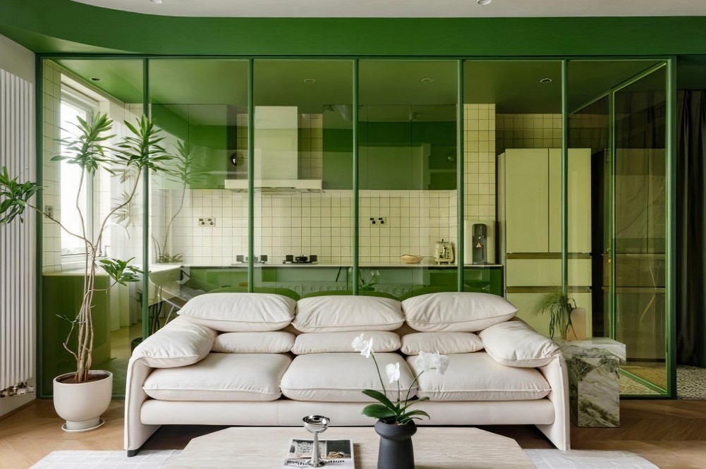 整屋的绿色色彩漆,色彩浓厚但不过于耀眼,越看越舒适。过道则是加入了艺术漆,丰富墙面的材质质感。
