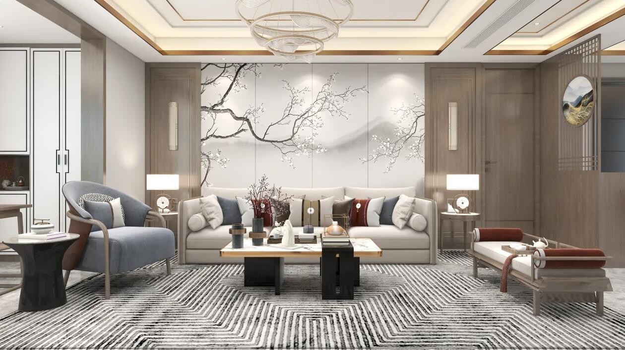客厅整体以古典端庄的装修风格为基础,奠定了生活的优雅与美韵气质。原木灰调饰面布置于客厅两侧,中间以梅花山水写意背景铺展开,在简约不简单中便营造出日常的素雅氛围。