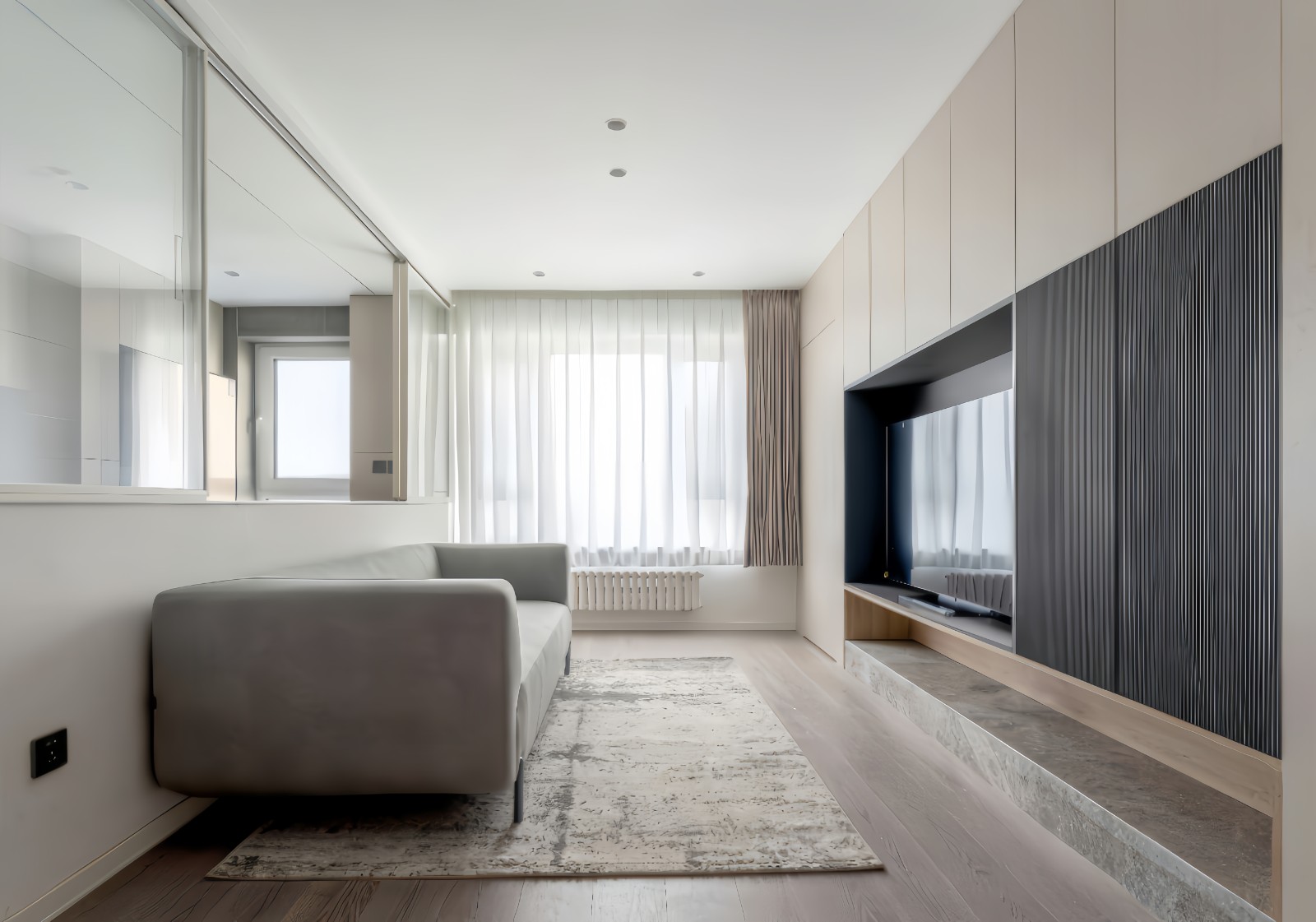 两侧卧室选用无边框无把手的隐形门,与电视收纳墙形成呼应。