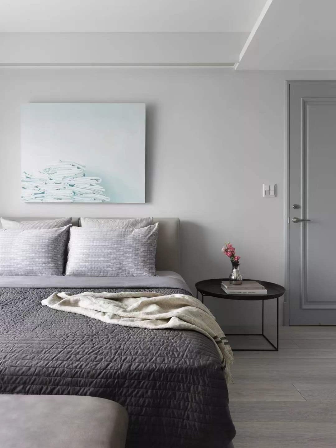 主卧室空间简约,浅灰色墙壁,搭配粉色的,鲜艳却不刺眼的软装,使得主卧温馨中有个性。