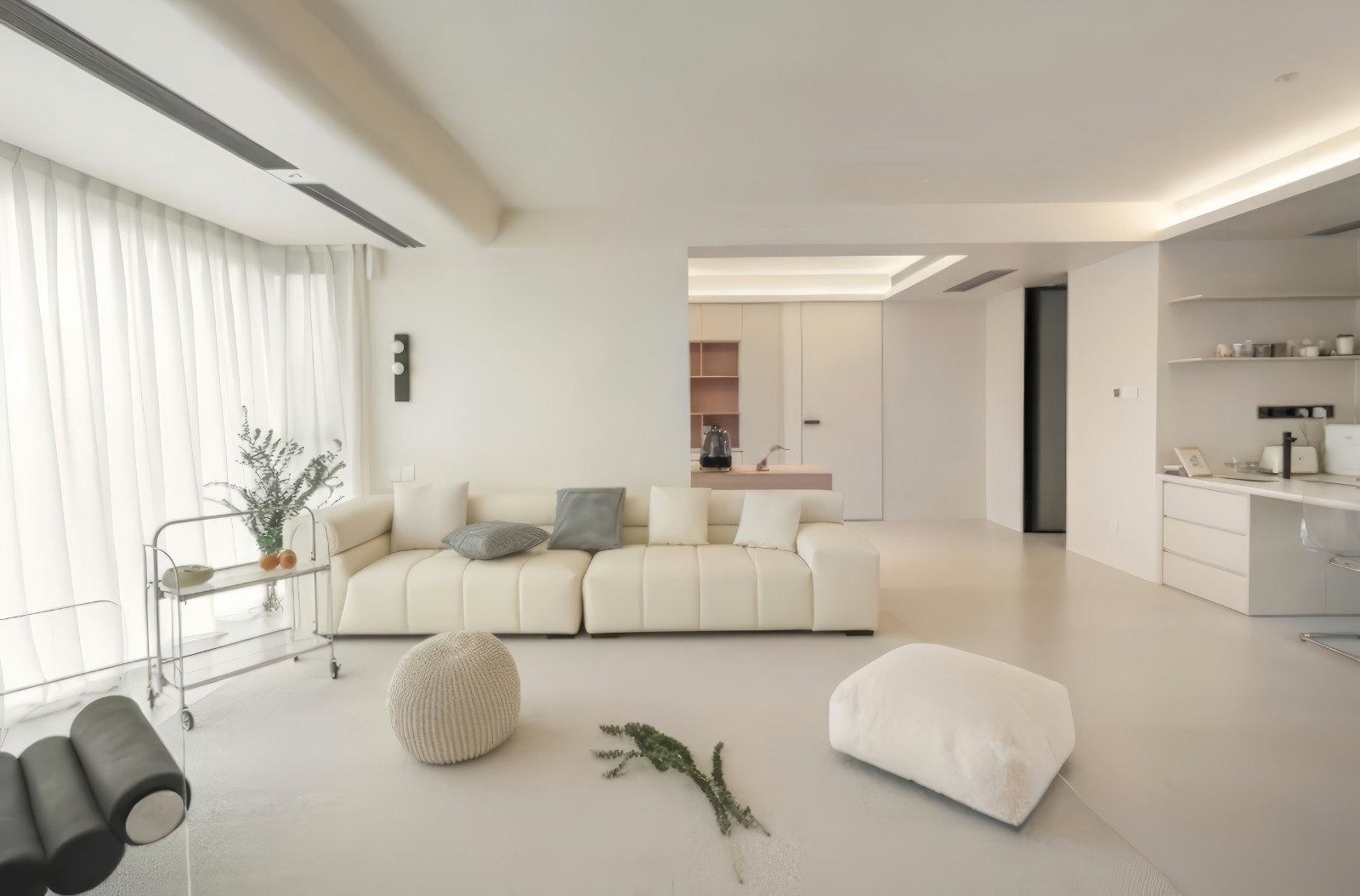 全屋用温馨的奶油打底,软装家具的选择也大多以低饱和度的颜色为主,打通书房的一面墙让整体空间更加开阔。