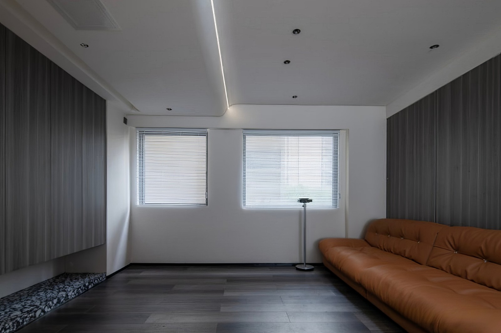 另外一个角度看客厅,依然是极度简单的搭配,这个角度有3个点睛之笔的设计运用:1、用百叶帘来柔光。 2、天花用了一条线性灯+弧形避梁设计。 3、沙发墙与电视柜同色材质的板材。