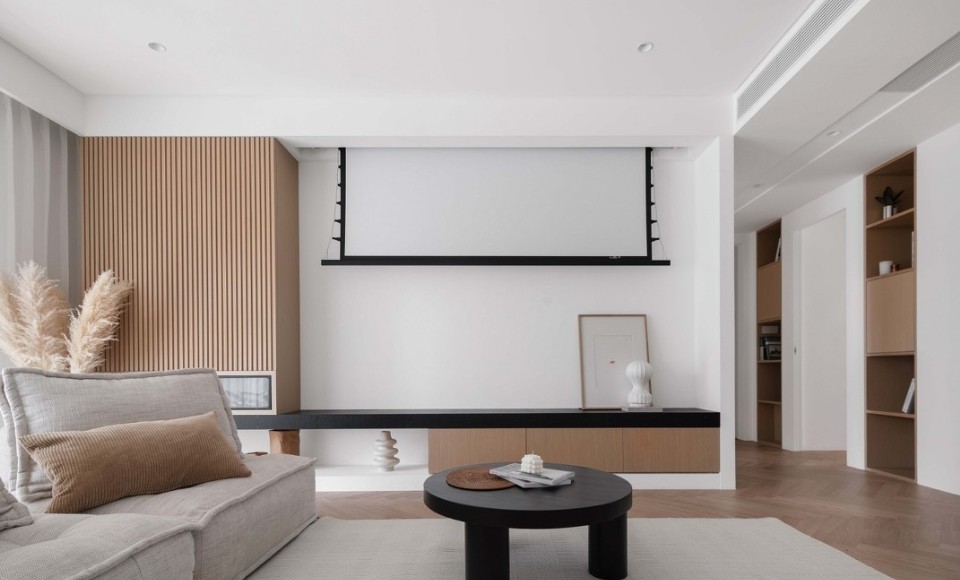 客厅采用全吊顶无主灯设计,背景墙的白色与沙发的暖色和电视柜的木色,体现柔和感的包裹,黑色的简约的木饰面,让人视干净整洁。