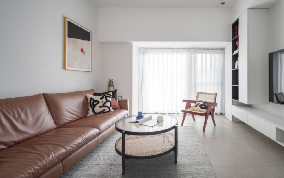 作为客餐厅里的主角,复古棕沙发丰富空间,搭配自然气息的编藤家具,克制而优雅。