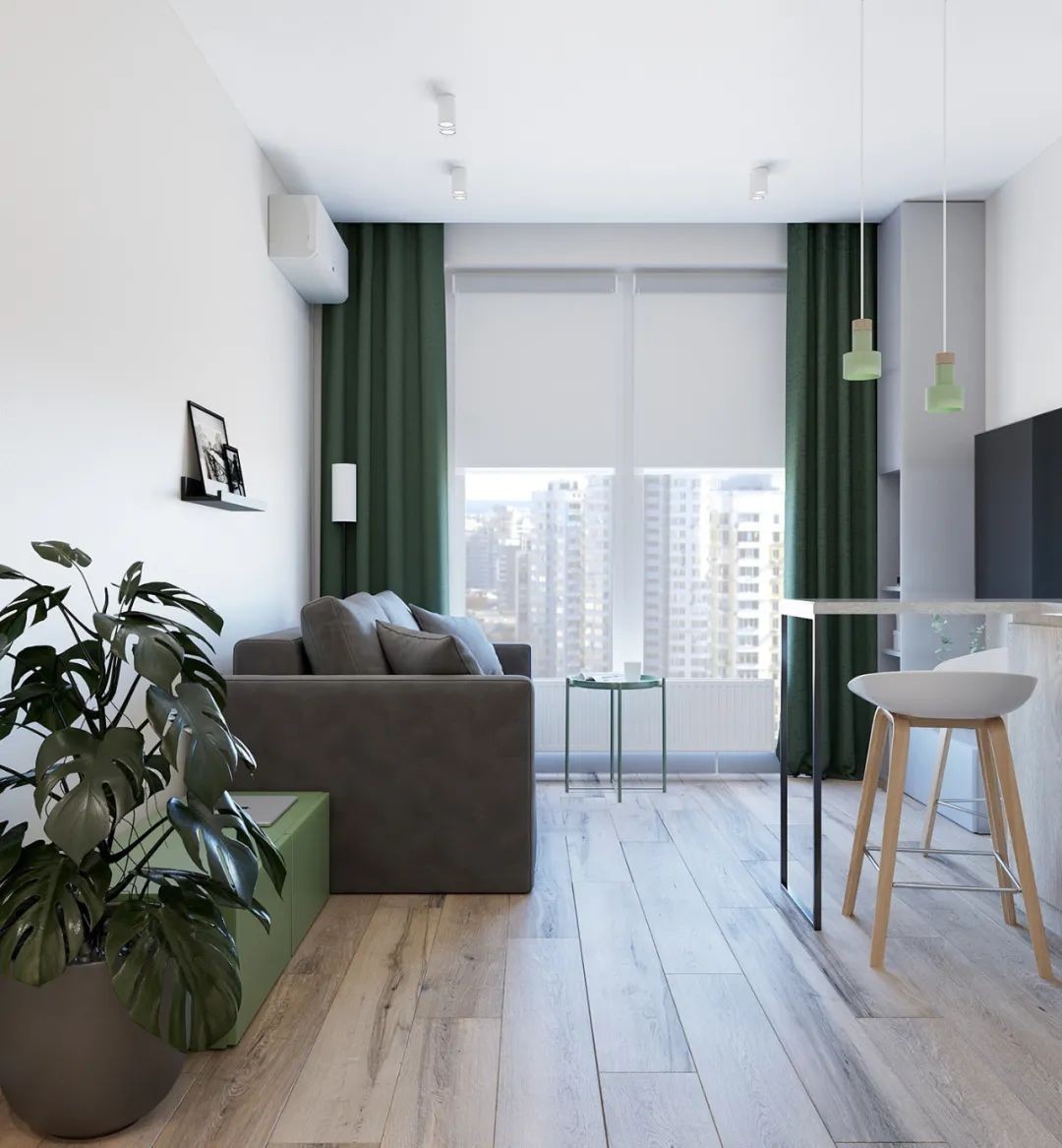 果绿与深灰被延续到卧室空间,浅灰色的床品纺织搭配其中,深浅交替增加层次感,精致小巧的植物贴心地点缀空间。