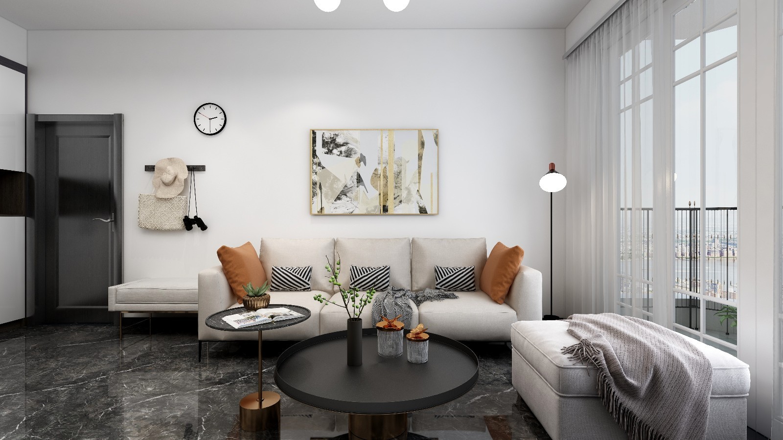 整体客厅是仿大理石纹黑色地砖,家具用了简约高端的米白色搭配,都是设计师为业主精心搭配的软装设计