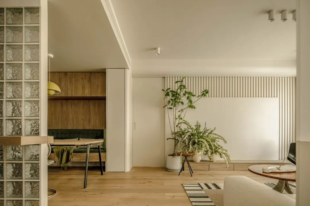 客厅的主角,是没有电视的电视背景墙。留白的墙面在屋主夫妻的眼里,是一块神奇的画布。设计师用格栅板做底,增加整面墙的层次感。 平时的插画,和精心照顾的绿植,都是画布上的主角,一种自然的气息油然而生。
