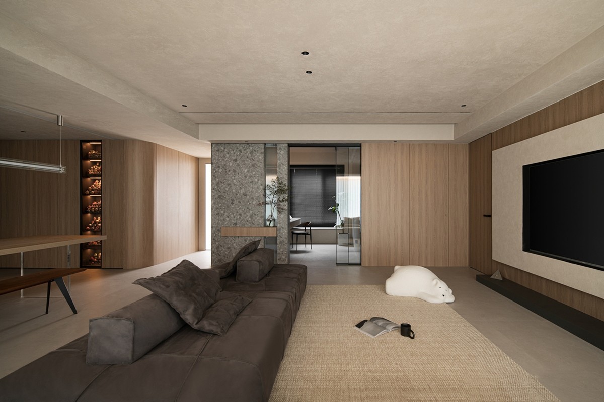 客厅优化内部生活需求,景观阳台一分为二,大部分给予客厅、卧室,扩充实际使用面积,最右侧则新建为独立生活设备区空间,利用隐形门进行遮挡,完整客厅视觉。