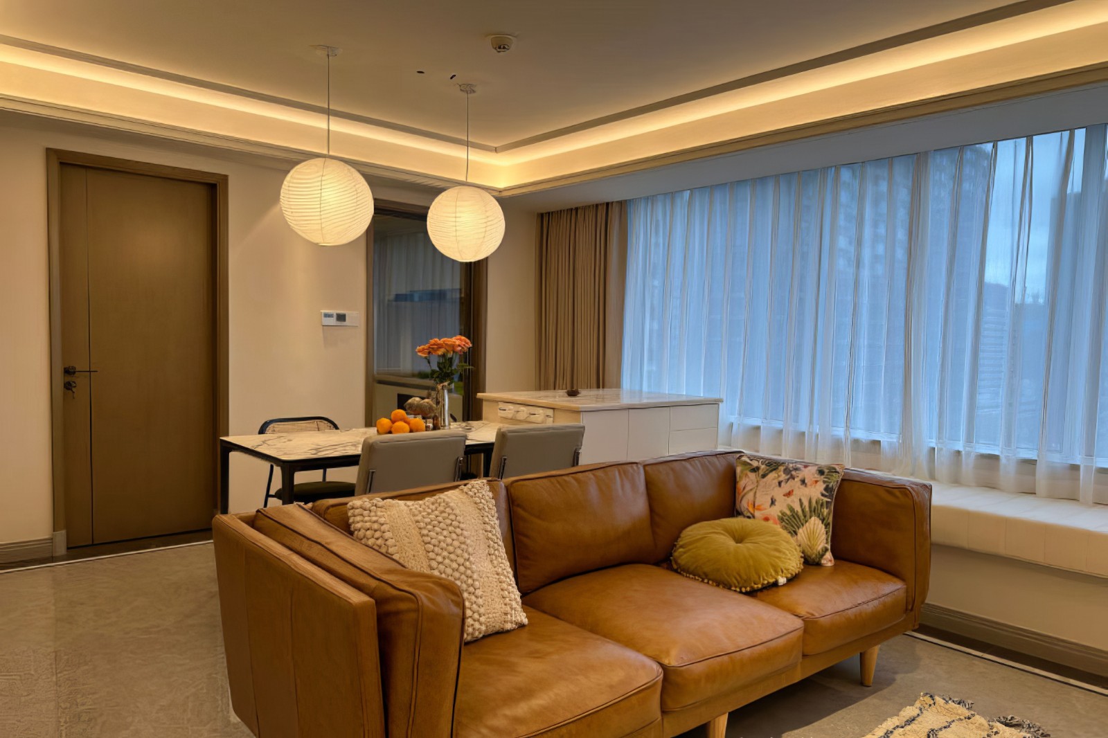 同时在电视旁我们放置了一盏带有装饰性、雕塑感的吊灯,让整个空间更有艺术的调性。