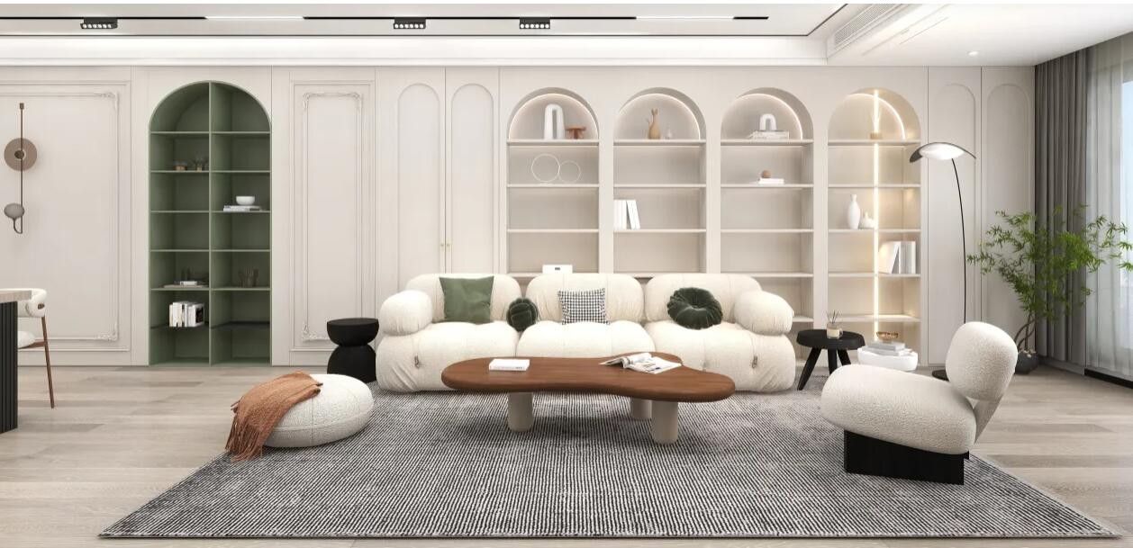 柔和的光与纯净的白,用绿色做点缀色,色调沉稳内敛,增加了室内温馨的感觉,提供宁静流光的避风港。