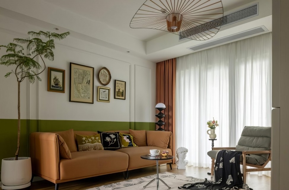 客厅电视背景采用pu框线,大气简洁。背景墙分色刷复古绿和菱花白,层次分明,风格凸出。