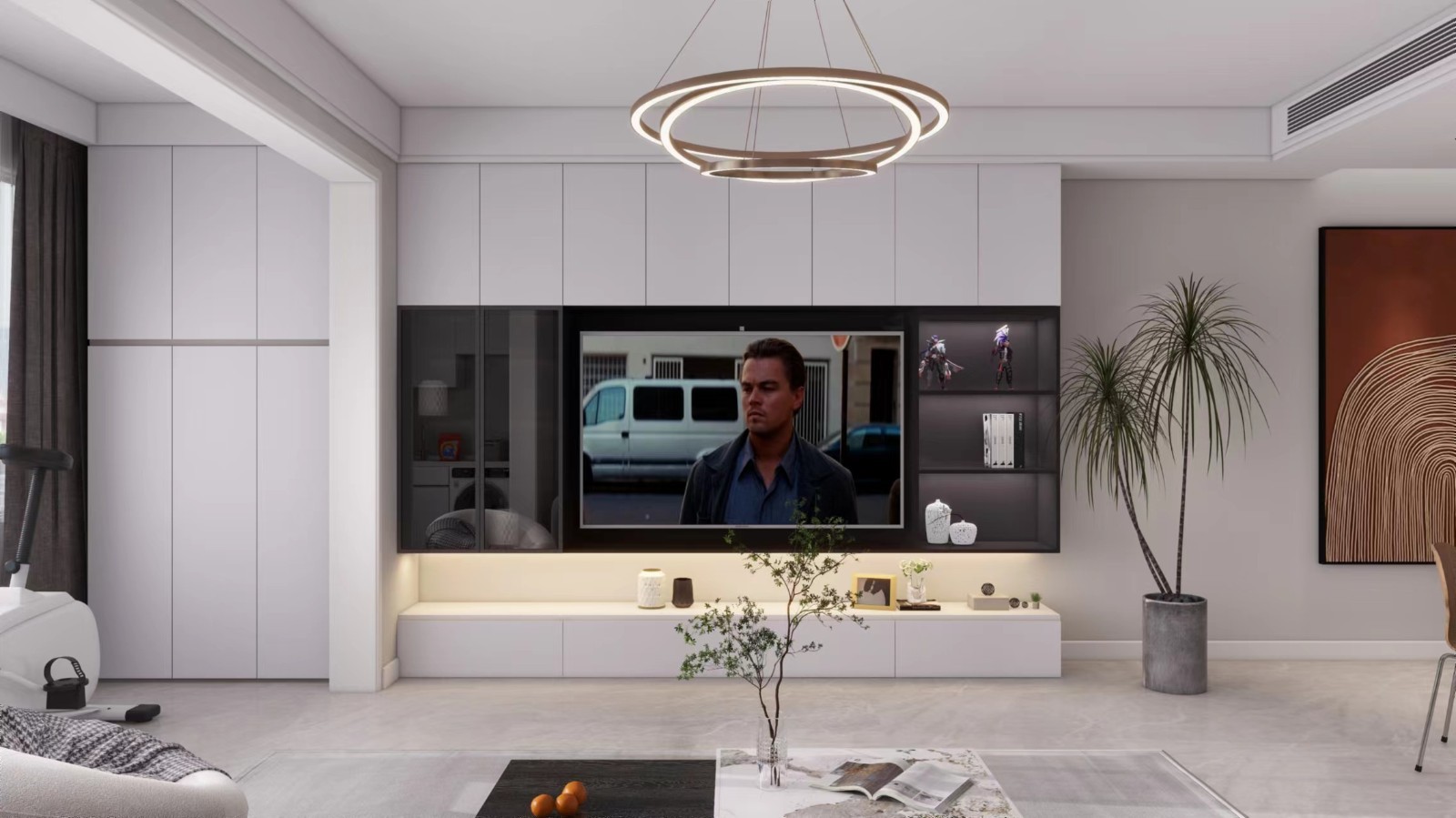客厅整体简洁的设计线条配以造型简约的双眼皮吊顶、主灯,低调优雅又不失氛围感