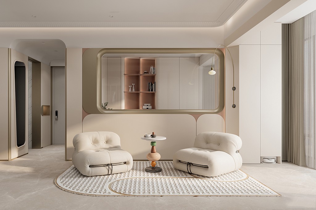 温柔的奶油色调缓缓拥抱整个空间,开启生活的悠然叙事。全屋随处可见的弧形元素,从平面的线条变幻成立体的圆弧,为室内设计增添了层次感和艺术韵味。沙发背景墙的弧形设计格外夺目,低调有光泽的铜色系自带简奢感,圆润饱满的曲线圈出温馨柔和的休憩空间。软乎乎的奶白沙发以弧形相应和,Q弹丰盈的体积感让人忍不住想要直接扑倒~铺上仿若奶油编织的绒毛地毯,酝酿出温暖松弛的氛围,奶油温馨在空间弥散开来。