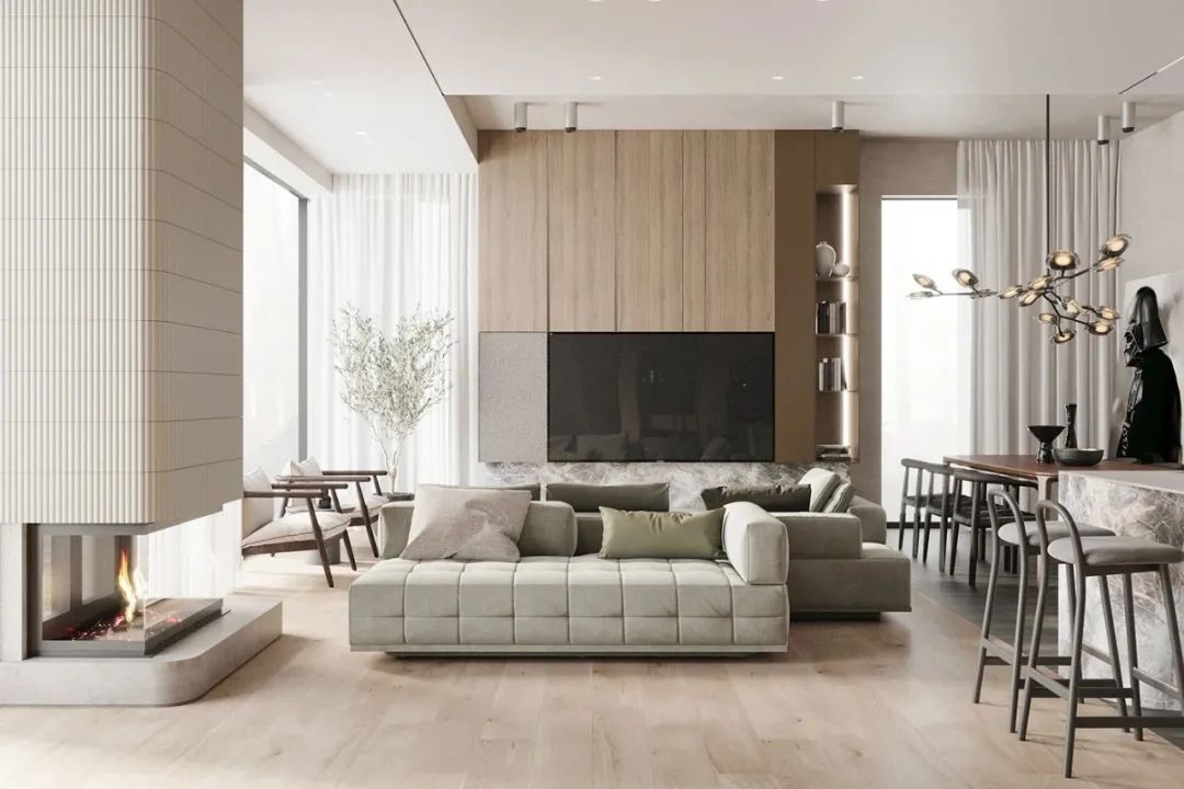 客厅中,原木色与***灰作为空间中的主色调,不同明度的灰色丰富了空间的层次,大面的落地窗为空间带来充足的光线。白色纱窗一旁的柱子底部做了一个壁炉,为空间增添暖意,营造舒适惬意的氛围。