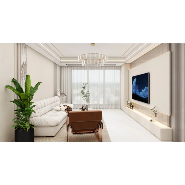 客餐厅背景墙采用平行线的设计要素,使空间均衡稳重,电视背景墙繁简对比以及结合灯带的使用让空间灵动且层次分明。