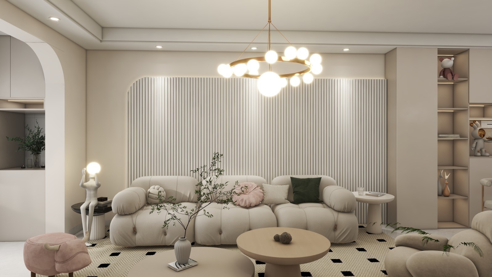 电视背景墙采用了法式石膏线条,调色了一个粉红色,整个空间看起来更加有少女感