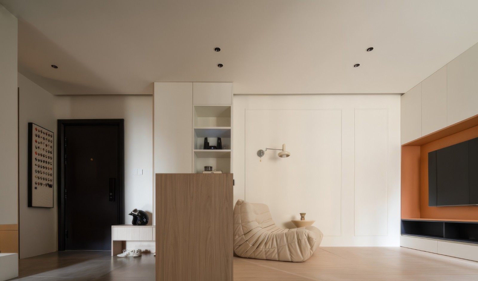 电视柜的设计采用了壁龛式设计,将电视机做嵌入式处理,保证整个空间的整体性,同时开放格做了跳色处理,低饱和度的橙色让柜体在视觉上变得更有活力。