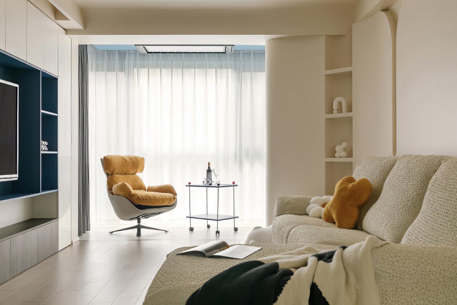 弧形背景墙也做了一排内嵌展示柜,可以放置一些小摆件和饰品,作为装饰,增添乐趣的同时也满足收纳需求。