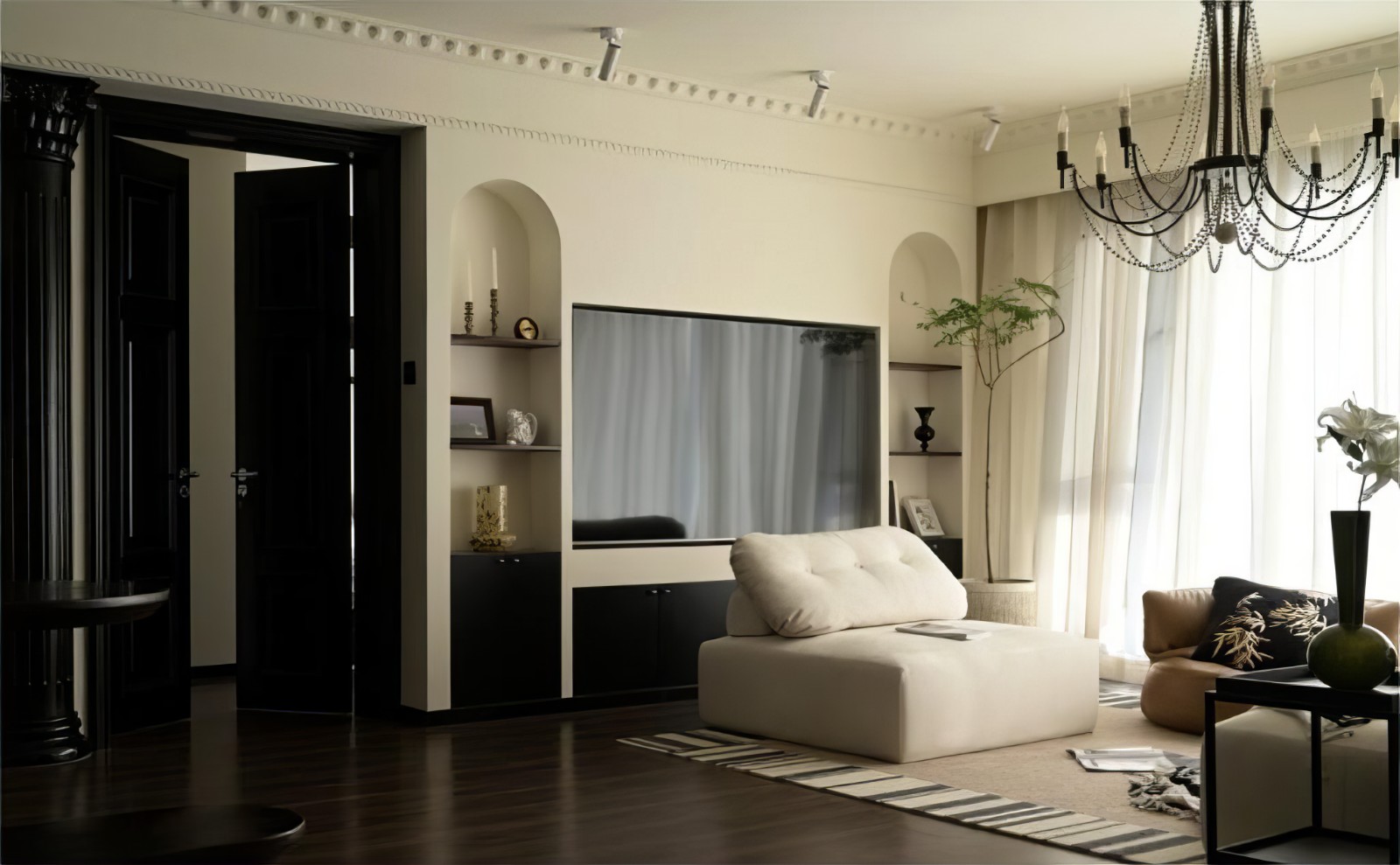 客厅一侧的书柜花了一些心思,这扇可以和次卧互动的窗户也是他们的想法,日常中即便两个人在不同的空间各忙各的,也可以有“在一起”的感觉,另一侧的弧形柜是可以打开做收纳的,既可以收纳又可以跟另一侧的柱子有一个互动。