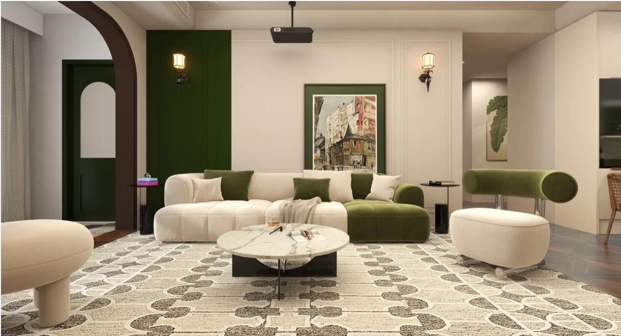 整体以墨绿为主色调,铁艺灯饰搭配石膏背景墙,油画作为点缀,艺术气息扑鼻而来,营造复古怀旧的空间,将阳台纳入客厅,中间以拱形隔断,复古地砖搭配藤编吊椅,闲暇之余看书,感受静谧与美好