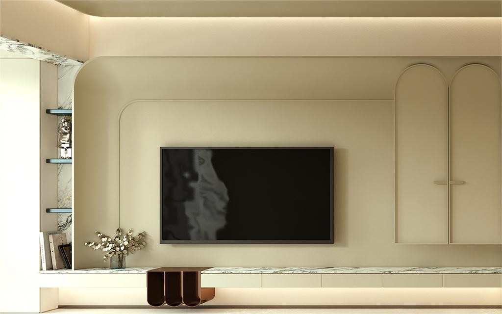 电视背景墙整体用烤漆板打底,四周弧形设计仿佛一个柔滑的碗形,自然地与梁位和开放格衔接,通透和柔和的氛围在客厅间缓缓游走。