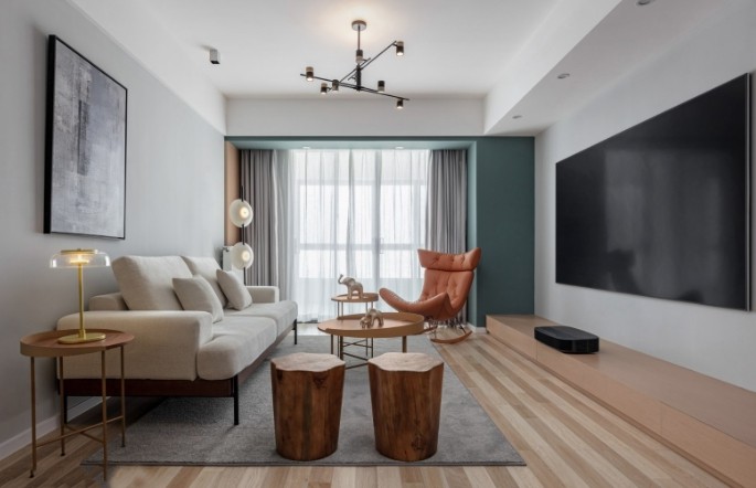客厅配上两个原木的圆墩,增添了自然生活的场景