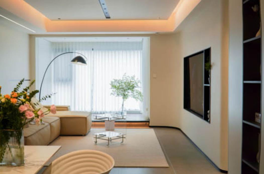 客厅整体通透、简约,全屋无主灯的设计,灯带的色温让空间看起来非常的温馨舒适,阳台绿植的搭配,也能够让空间显得静谧自然。