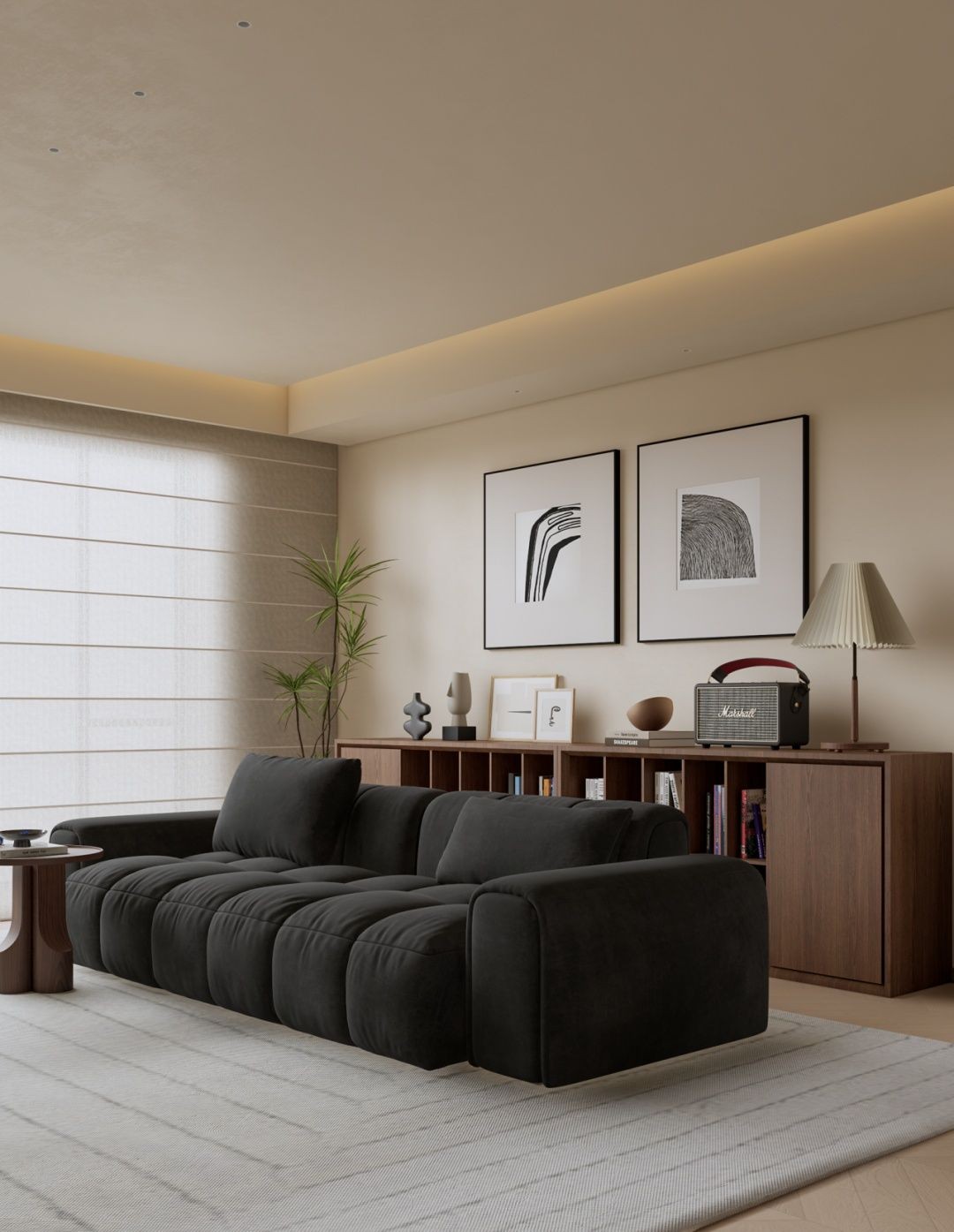 几何线条的地毯和黑色沙发作为视觉焦点,勾勒出优雅复古的休闲会客之所。