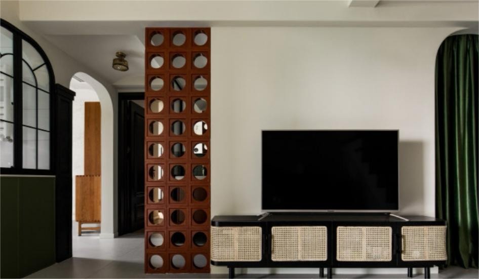 黑色藤编电视柜复古又不失质感,与整体空间风格相融合。