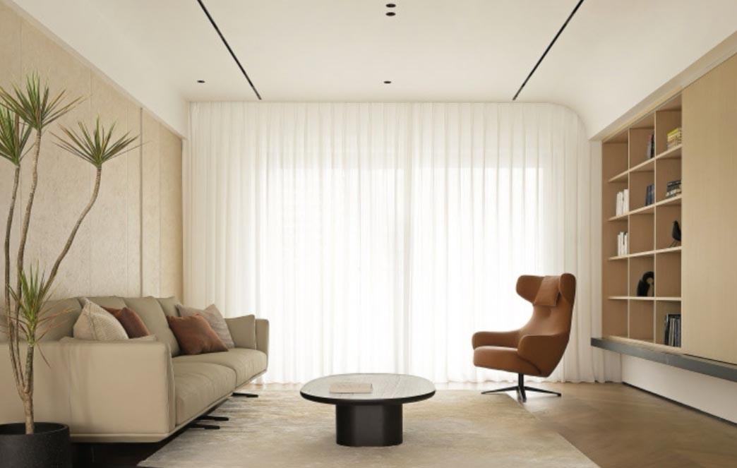 空间内随处可见弧形元素,圆弧形的茶几、靠背单人沙发或是墙顶的过渡造型,让全屋显得更加温润、饱满,更有家的温馨氛围。