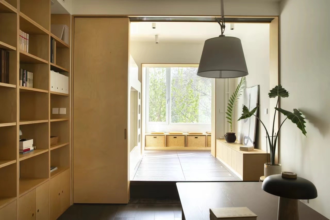 为了满足到一家人之间的交流互动把客厅和阳台之前的墙打通,增加了多功能陪伴型的学习客厅,客厅也没有传统意义的沙发,用坐垫或者榻榻米替代都可以。