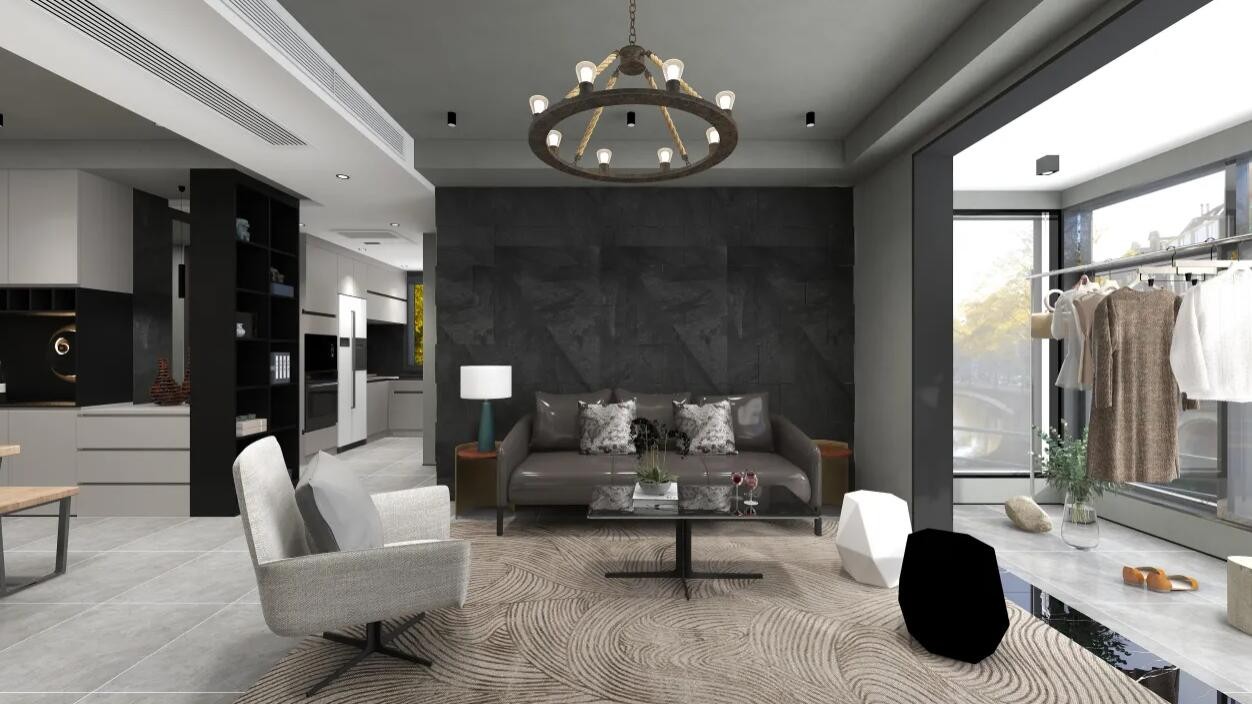 本方案为三室两厅工业风格住宅改造,套内面积共计85m²。工业风格整体色调偏冷,搭配上大金的中央空调,通过视觉与体感来营造清凉夏日。方案为了营造出工业氛围,使用了大面积的为水泥色,有一种冷峻的感觉,搭配上些许木纹,增添一丝柔和。吊顶选用了最简约的造型,颜色上选用了和墙面一样的水泥灰,使整体感觉更为统一。