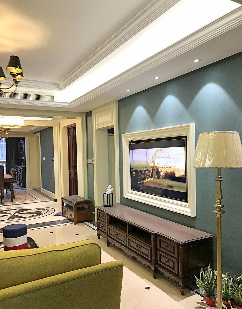 体空间风格以美式为主 稍微带点地中海风格的感觉 在色彩上使用了温柔的淡蓝色和白色的搭配