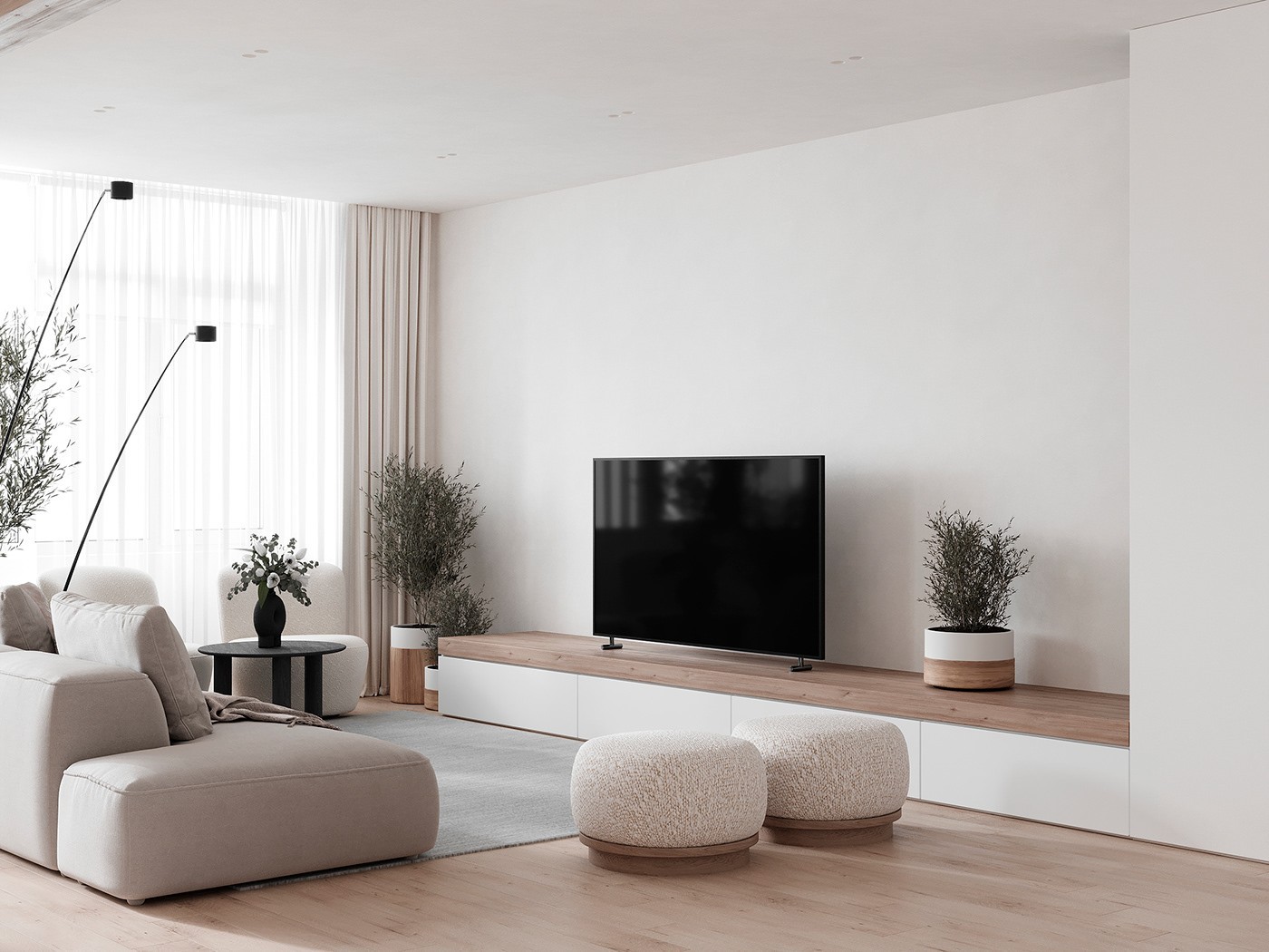公寓采用暖色调的白色、原木色和伯爵灰,采用更直率的烤漆面版、天然色橡木地板,增强了业主的个人风格,并赋予每间自己的特色