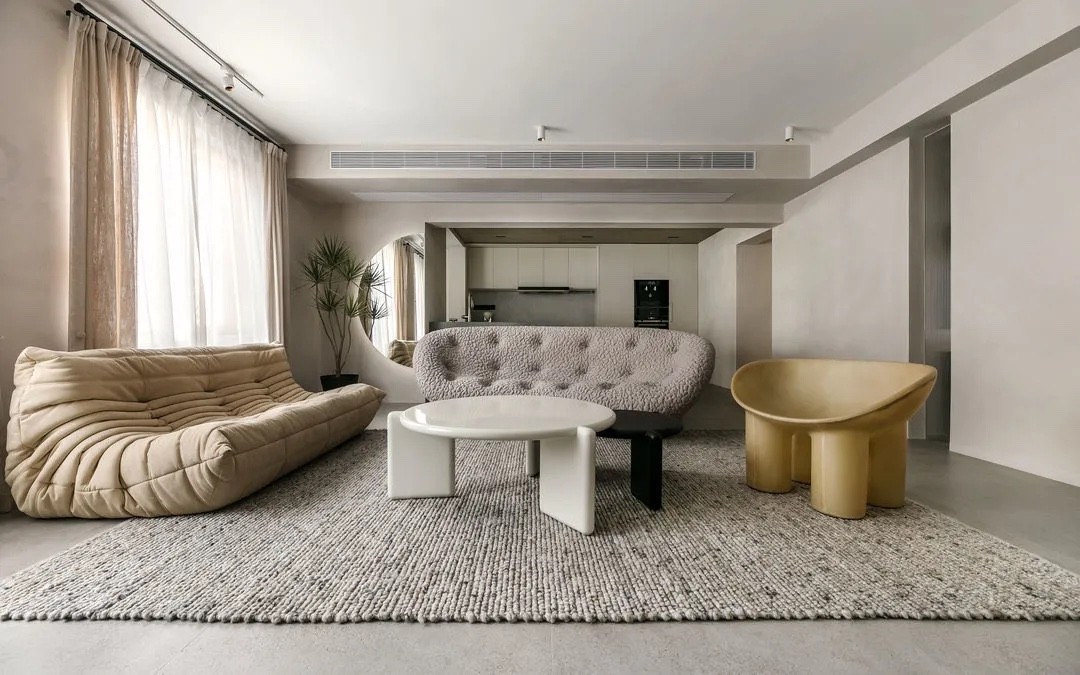原始层高只有2.55m,保证高度舒适性,全屋没有做吊顶。客厅无主灯设计,通过局部明装筒灯实现照明,营造柔和舒适的氛围。