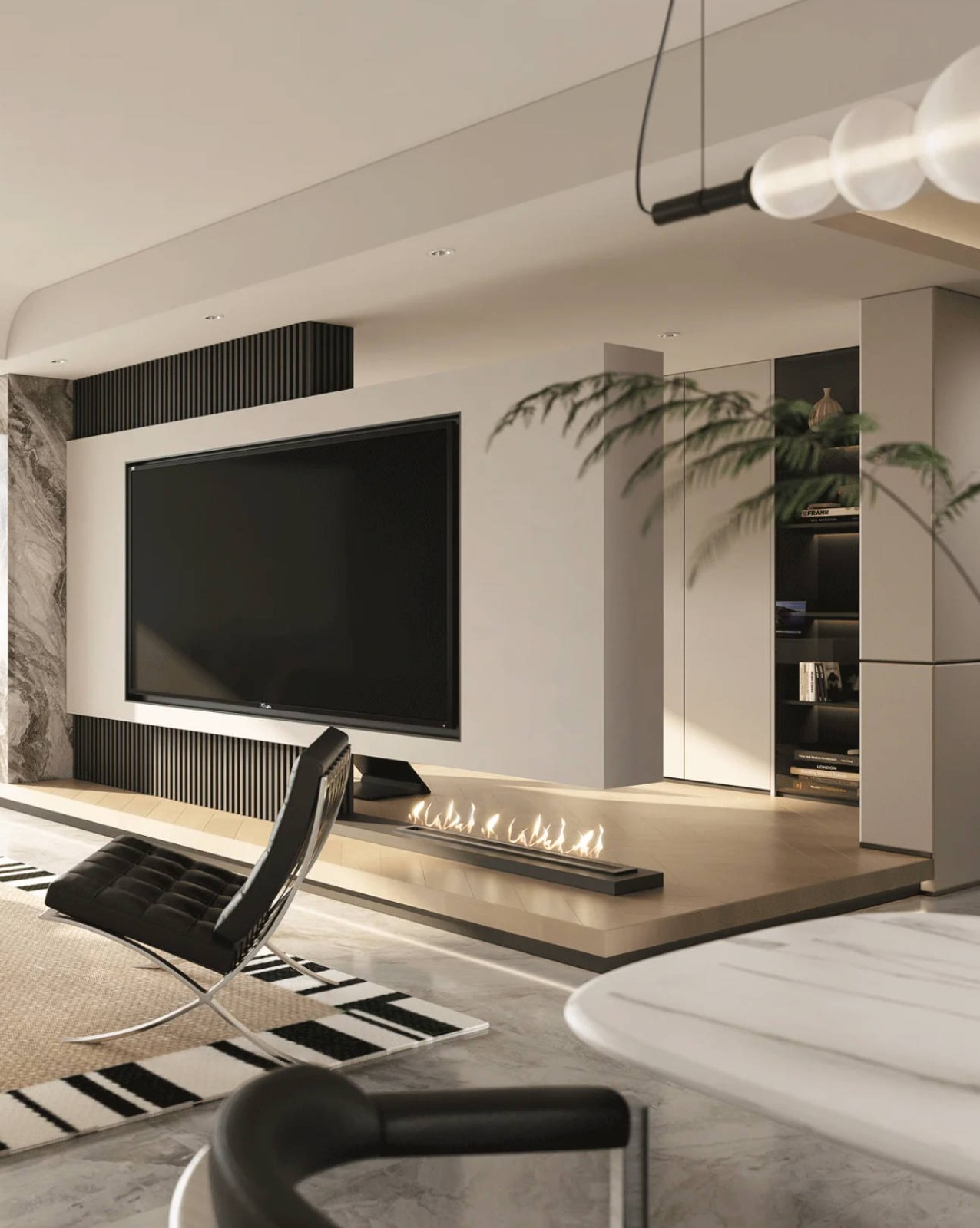 悬浮电视背景墙是整屋的***亮点,从沙发看向电视墙,半悬空的电视墙完美加持了客厅纵深感,视觉上显得空间更大更有层次