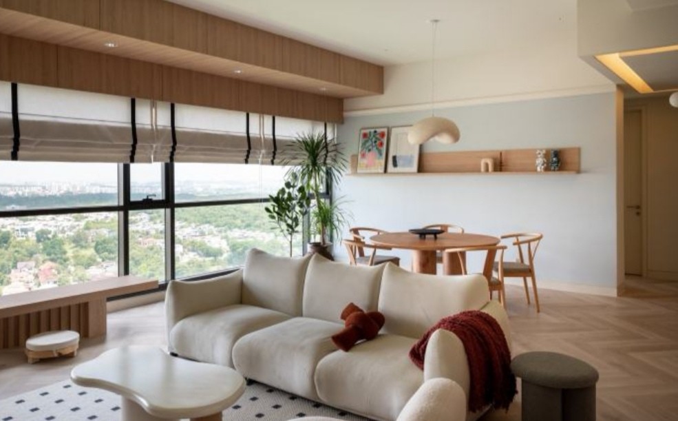 朴素客厅兼具茶室,静谧与素雅,营造此空间搭配两张灵活小件圆凳,坐感舒适,一凳多用,方便移动。靠落地窗设计,日式拉帘,既观景又待客,成为多功能的存在。