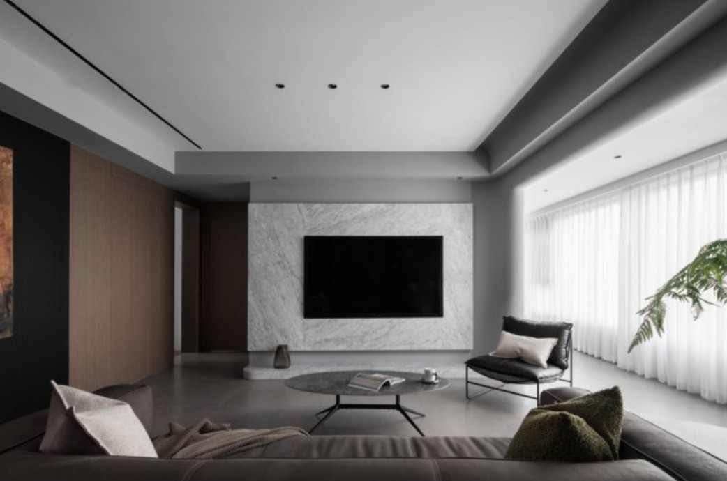 用纯熟的线条技巧让空间显得利落轻盈,不同的墙面材质丰富视觉感官。电视墙与阳台转角的弧形结构为现代风格这一理性氛围注入感性的柔软之美。